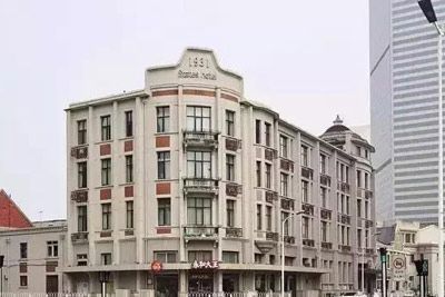 大阔饭店位原英租界的马场道(今浙江路)上,第一代大阔饭店是由一对爱尔兰夫妇兴建的,但后来毁于一场大火。1931年犹太人崔柏夫出资拆除了饭店的一部分,又在这个基础上加盖了几层,作为美国饭店(StatesHotel)使用。建筑为砖混结构,平面呈条状,弧形转角。该建筑风格特点受现代建筑思潮的影响,注重功能和形式的简洁,具有现代主义特征。