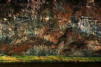 亿万年前绰尔河裂隙式火山喷发时溢出的玄武质熔岩流被绰尔河不断切割,形成如今的悬崖陡壁,岩壁高约70米、长约300米。熔岩流中发育大量垂直的柱状节理、束状柱状节理和水平柱状节理,与从熔岩流顶部风化成壤后掉落下来的黄色土壤和岩石裂缝中生长的一簇簇绿色灌丛苔藓一起,惟妙惟肖地构成了一个浑然天成的彩色壁画。在蜿蜒100余公里的绰尔河谷中,分布着大量此类鬼斧神工般的玄武质熔岩流柱状节理奇观异景。