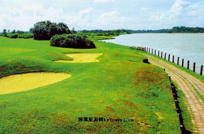 在这设有18洞,72杆,全长7019码的球道上,前9洞绕岛环走,周围环江绕海,四面碧水泛波,融海天风光和远山近水于一体。后9洞岛中穿行,集沙池奇石、椰林苇荡、田园景色于一身,即使是盛夏也是凉风随身,侯鸟伴行,俨然一座既过球瘾又有野趣的自然公园。