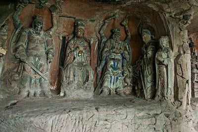 舒成岩摩崖造像,是大足地区珍存道教石刻。以第三号窟紫微大帝窟为例,凿造于南宋绍兴年间(1131—1163年)。窟正壁上刻有紫微大帝,面西端坐双头龙靠椅上,坐身高1.30米,肩宽0.40米。在主像的左右二侧,各立一-神将,身高1.45米,均头戴束发金冠,冠侧有绳系于颈,身着铠甲,横目怒目。