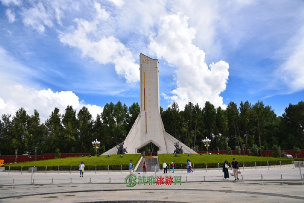 广场南面,矗立着西藏和平解放纪念碑,这座2001年建成的纪念碑,南以远山绿树为背景,北与巍峨壮丽的布达拉宫相距三百五十米,主体呈灰白色,总高37米,碑体南面铭文上端设五条金带,代表西藏和平解放50周年。碑身造型是抽象化的珠穆朗玛峰,表现出纪念碑高耸入云的气势和与天地同在的永恒性。
