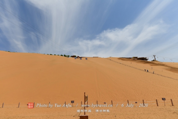 沙坡头,位于中卫县城西20公里处的腾格里沙漠南缘,黄河北岸,乾隆年间,因在河岸边形成一个宽2000米、高约100米的大沙堤而得名沙陀头,讹音沙坡头。百米沙坡,倾斜60度,天气晴朗,气温升高,人从沙坡向下滑时,沙坡内便发出一种“嗡———嗡———”的轰鸣声,犹如金钟长鸣,悠扬宏亮,故得“沙坡鸣钟”之誉,是中国四大响沙之一。站在沙坡下抬头仰望,但见沙山悬若飞瀑,人乘沙流,如从天降,无染尘之忧,有钟鸣之乐,所谓“百米沙坡削如立,碛下鸣钟世传奇,游人俯滑相嬉戏,婆娑舞姿弄清漪。”正是这一景观的写照。