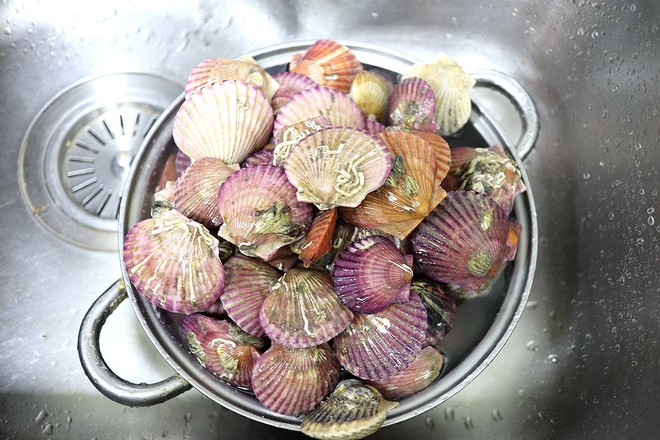 1.红扇贝一盆,倒入盆中,置于水龙头下;