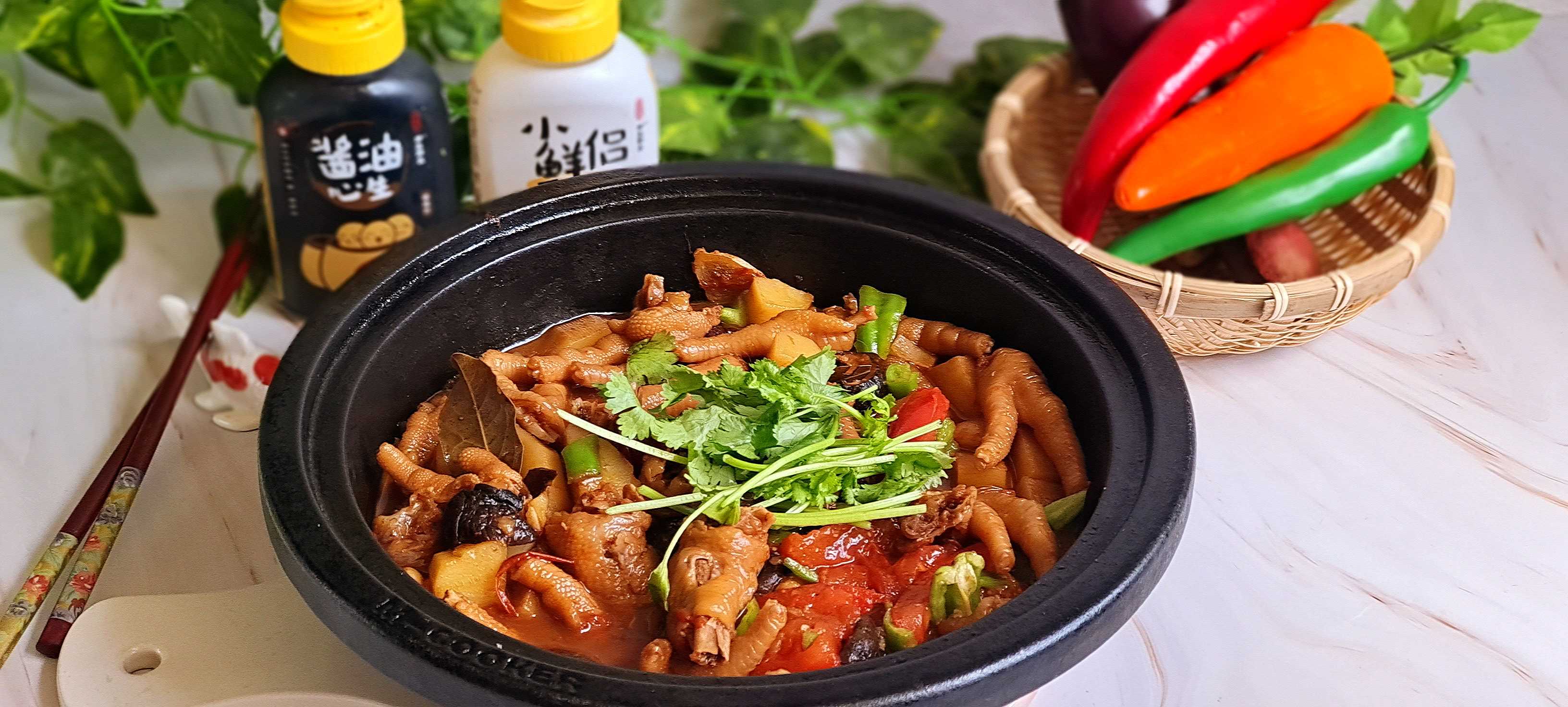 主料:鸡爪(8个) 番茄(1个) 土豆(2个) 香菇(6朵) 青椒(1个)