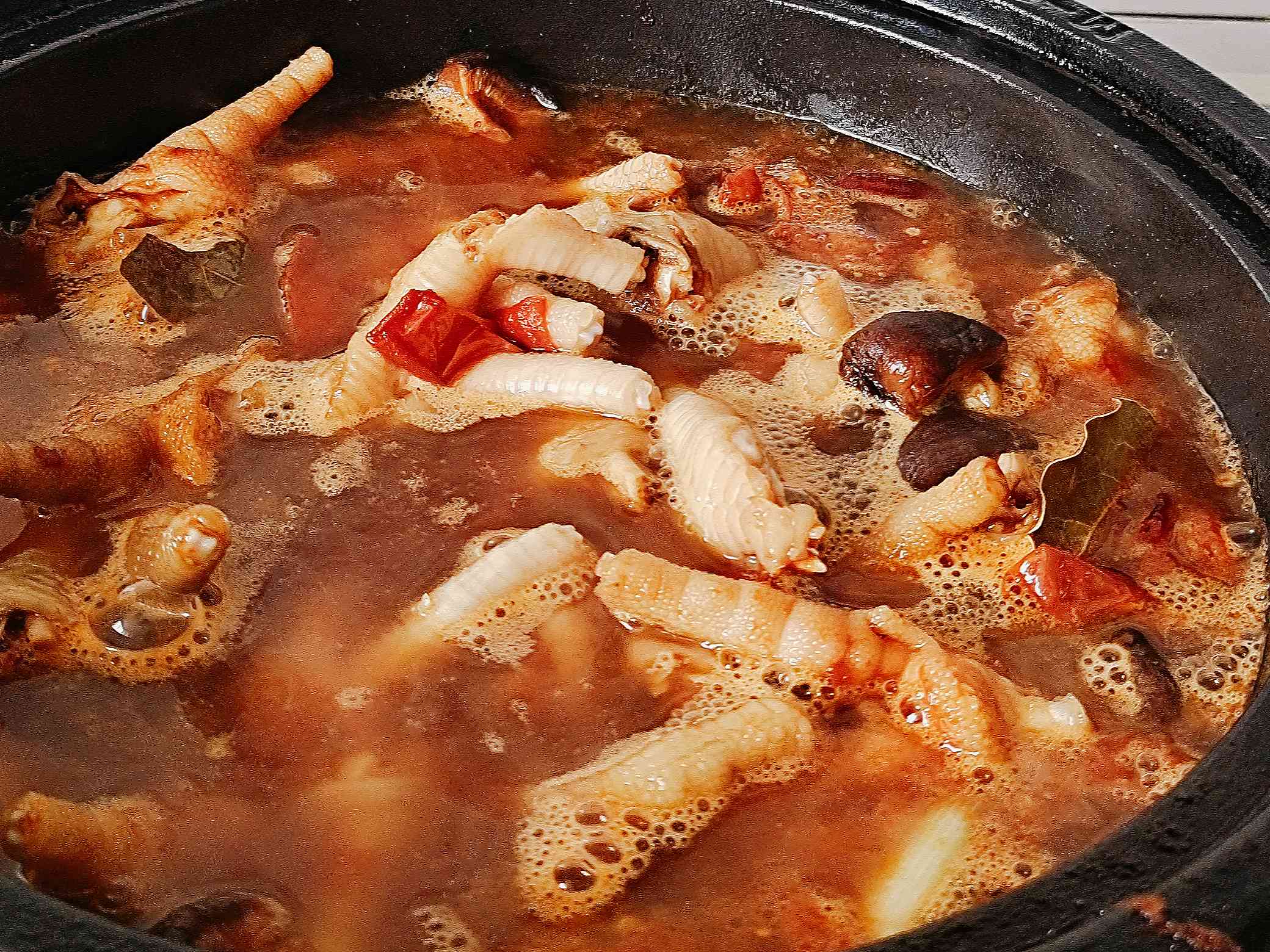 5.放入调味料鸡爪,番茄,香菇翻炒。
