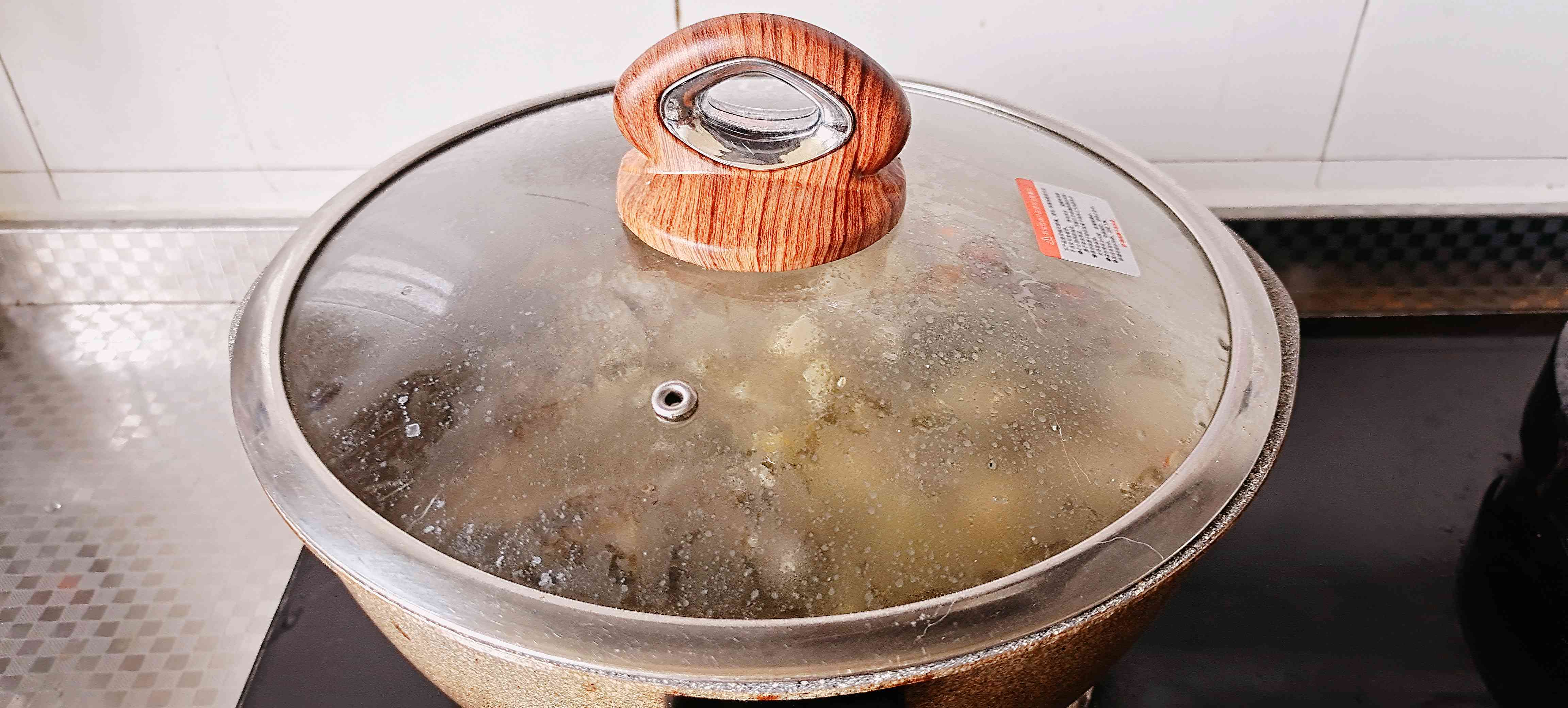 4.鱼头,鱼骨煎至片刻,加入葱姜,蒜瓣,花椒