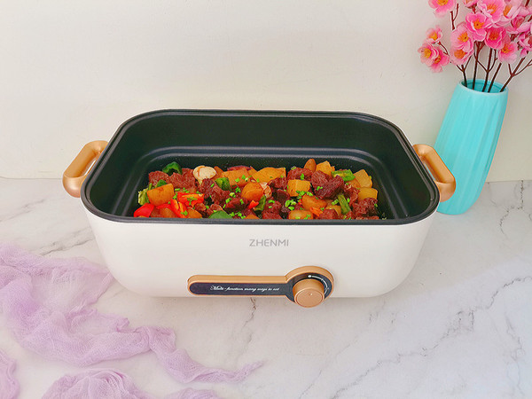 10.使用的锅是臻米多功能料理小白锅,可以煎炒蒸煮炸烤焖炖烙,还可以铁板烧和做火锅,一锅多用。深烤盘、不粘锅、5S速热、三挡温度调节、容量也比较大,好用实用。