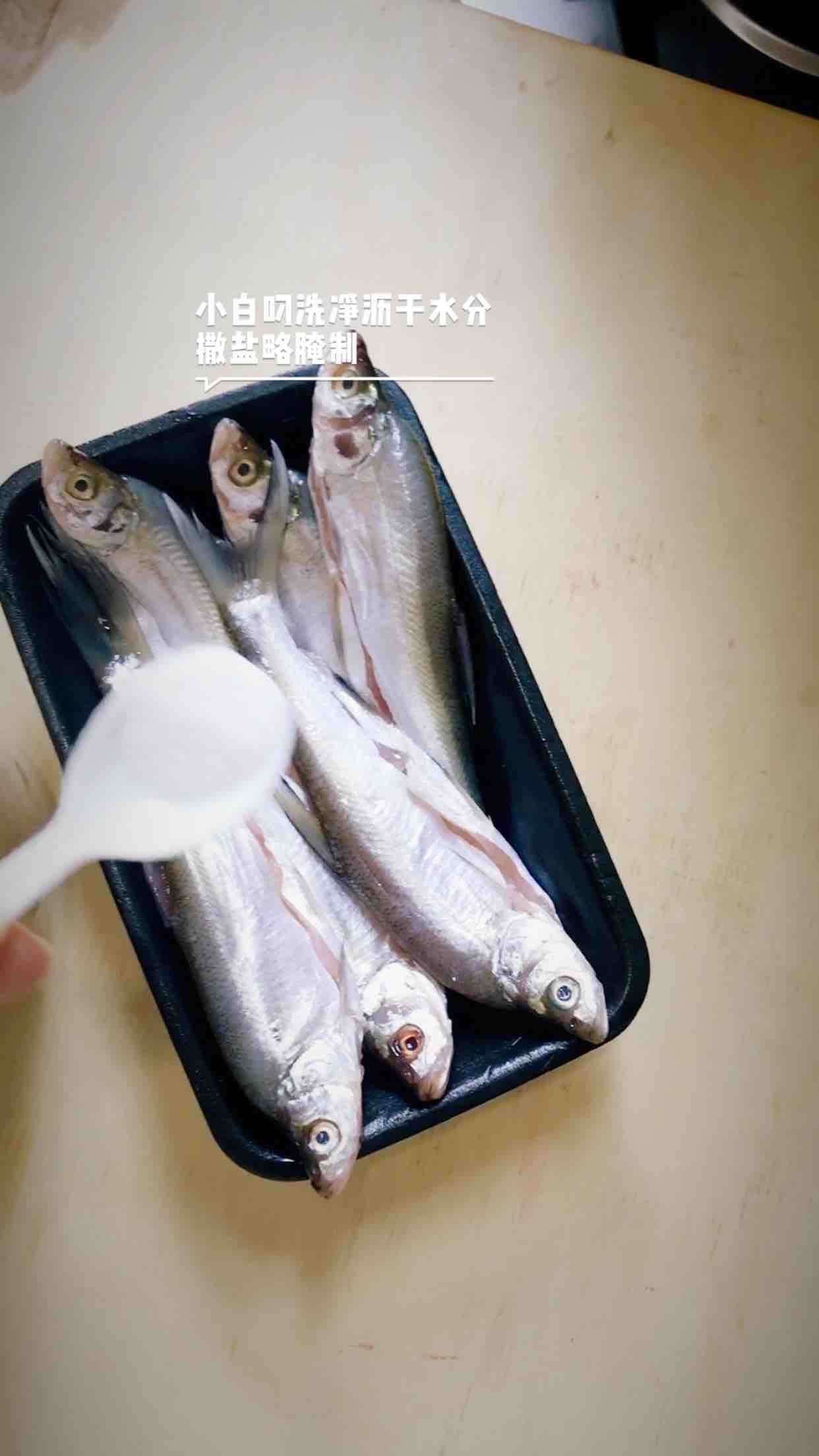 2.刁子鱼洗净沥干水分,撒一层盐腌渍1小时备用。