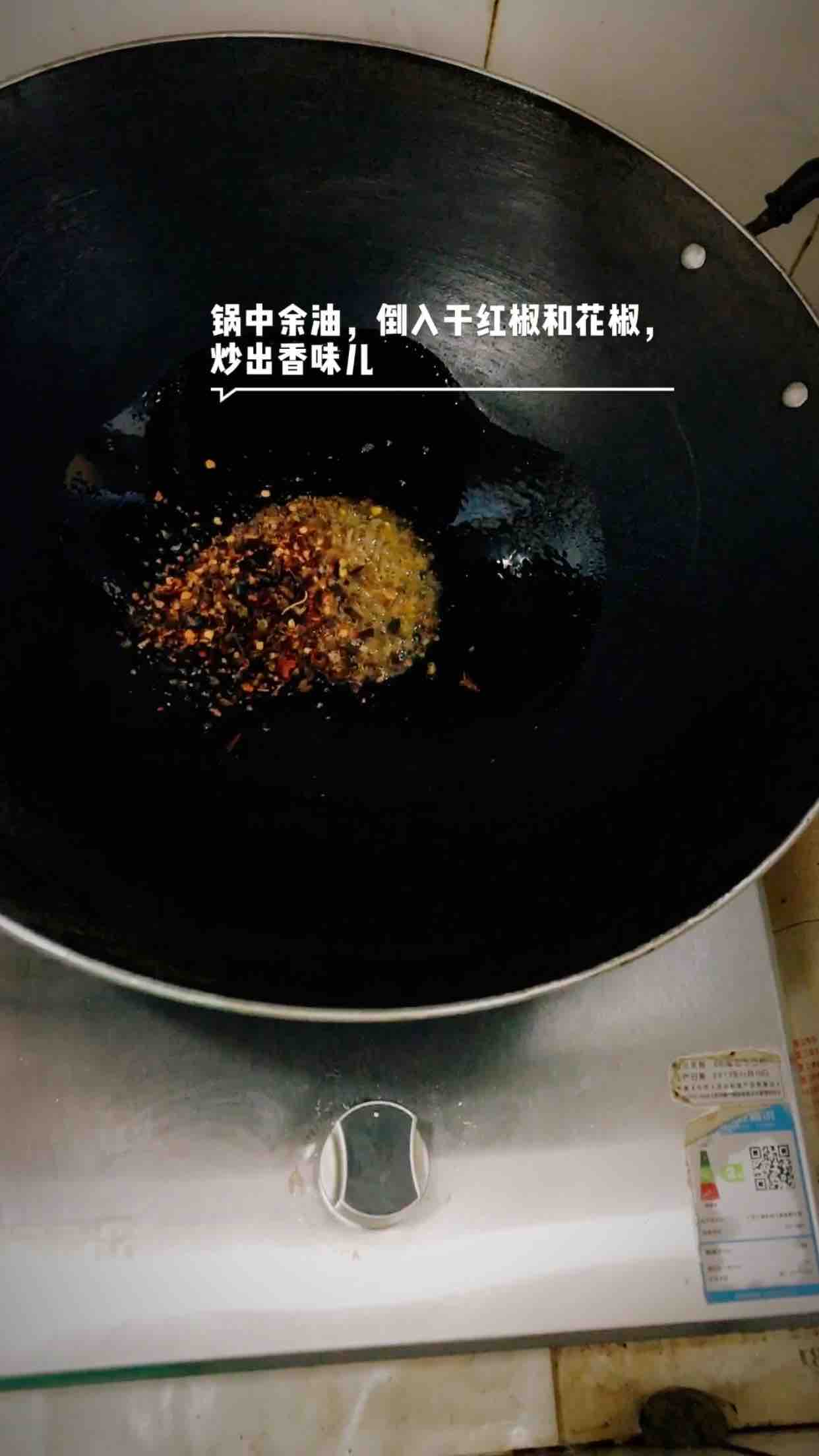 5.锅中余油倒入干红椒和花椒,炒出香味儿。