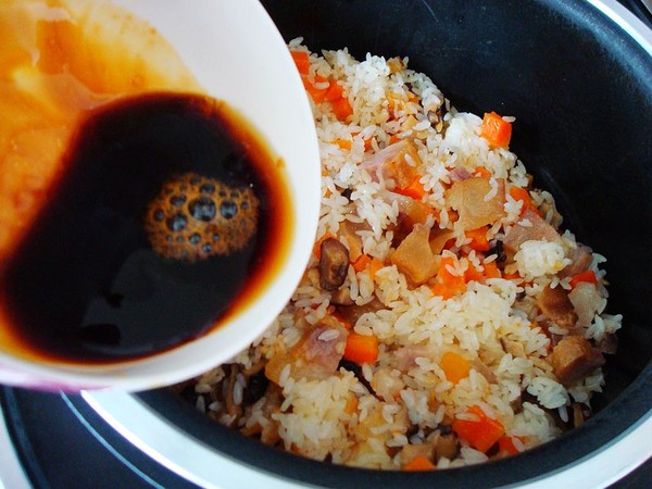 4.大米洗净,电饭煲里加大米和水,加清水要比平时少一些,因为胡萝卜和香菇要出水分,码上腊肉片,可以把腊肉搅拌均匀,这样好熟透,这样熟透以后出的油脂要被大米吸收了更好吃
