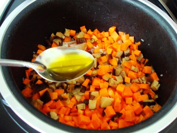 6.加两大勺植物油,这样煲仔饭味道更好,而且熟后米粒不会相互粘连,是一粒粒的。