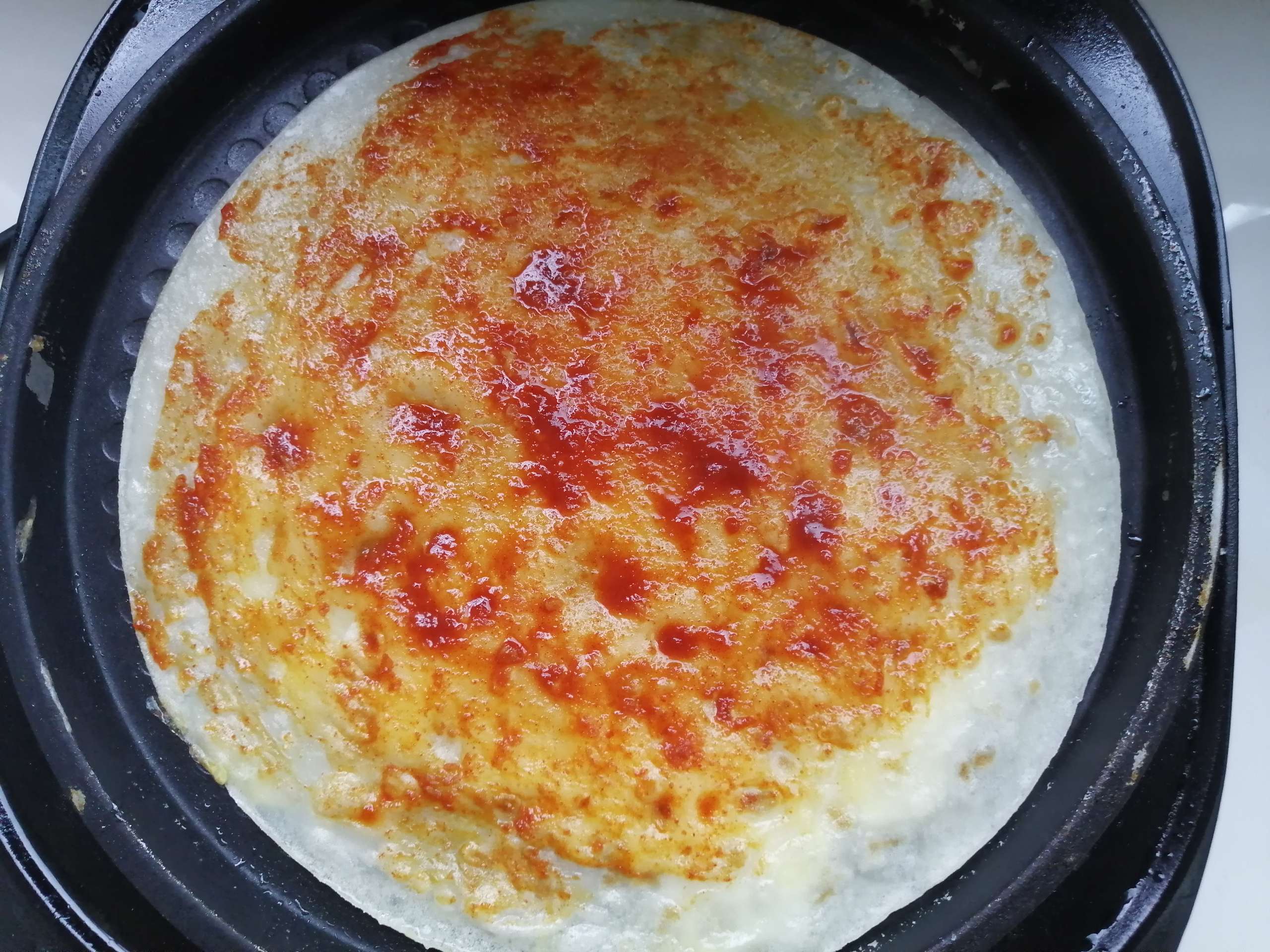 6.刷油,翻面,打入一个鸡蛋摊匀