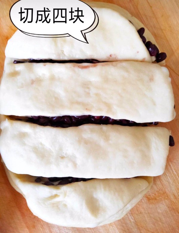 6.接着擀开放上煮熟的红豆,如下图所示。