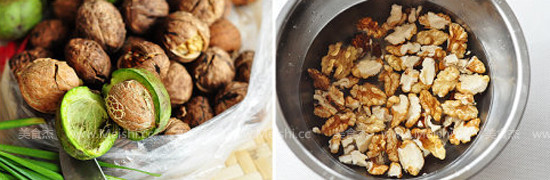 1.将核桃一一钳碎,剥出核桃仁,洗净
