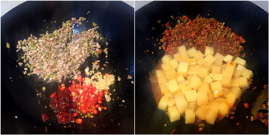 3.热锅少油,放入肉末、酸豆角炒香。下小米椒、蒜、豆瓣酱混合均匀炒香,然后放入米豆腐。