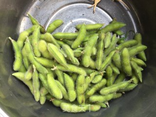 2.摘了一些自己种的毛豆,洗净。用剪刀减去两头的部分以便入味。