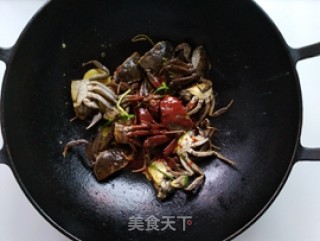 4.下入螃蟹,切面贴锅底,小火慢煎几分钟。