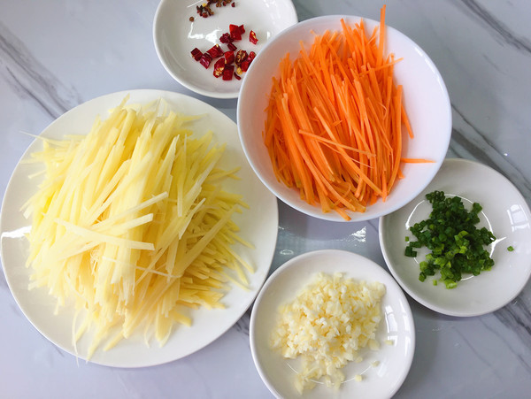 2.接下来我们先处理食材:先用削皮刀将土豆和胡萝卜削去外皮,清洗干净后先切成薄厚均匀的片状,码放好后再改刀切成细丝。然后将香葱清洗干净后切成葱花、大蒜去皮后切成蒜末、干辣椒切成辣椒段备用。