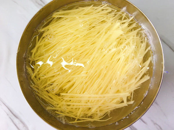 3.将切好的土豆丝放入料理盆中加入清水清多洗几遍,把表面的淀粉都清洗干净后用清水浸泡。如果一次切了很多土豆丝,一顿吃不完的话,也可以冲洗干净淀粉后再加入清水浸泡着,下一顿直接捞出来炒就可以了。