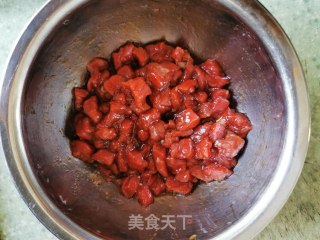 10.锅内放油,油热后放入牛肉粒,中火翻炒两分钟。