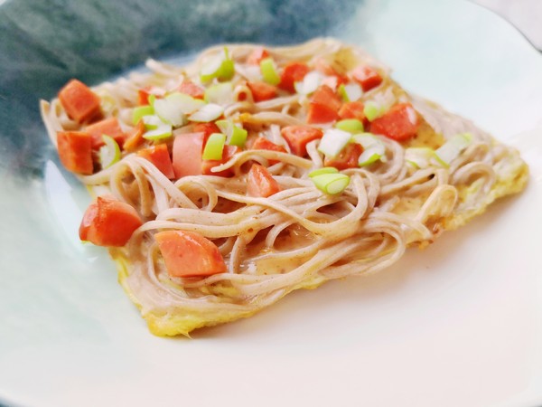 2. 荞麦面条蛋饼的上面可以根据个人的喜好来放配料哦。
