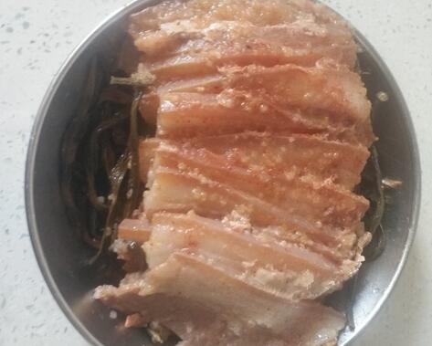 5.蒸肉上面放入切段的泡发干豆角,上高压锅蒸制40分钟。