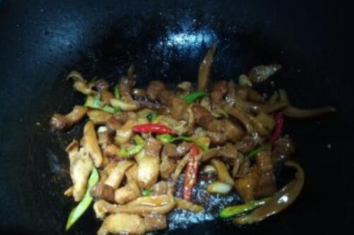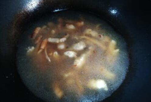 8.放入红辣椒、青辣椒丝、大蒜粒。