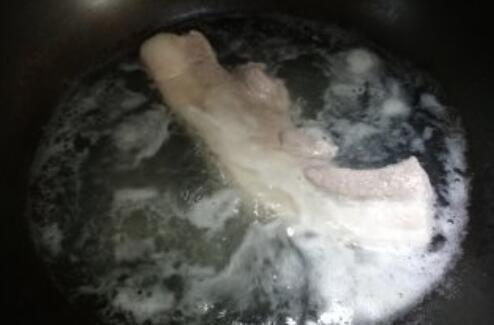 2.墨鱼干提前浸泡一晚冷水放入烧滚绰水后改刀切片。