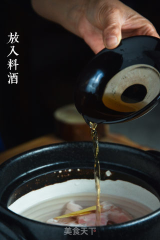 2.猪蹄剁成小块,冷水入锅,加入料酒、姜片、白胡椒粉。