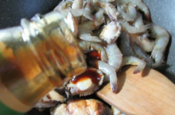 5.接着,合入鲜虾和鲍鱼,加适量的料酒。