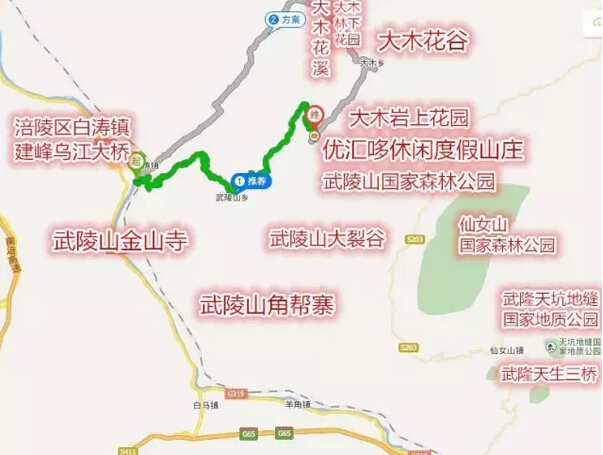 湖北利川出发:利川-涪丰石高速-涪陵东-白涛涛-武陵山大裂谷。全程约265公里,2.3小时车程。