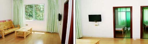 1、以套房的形式住宿,每套房二室一厅一卫一厨,液晶电视三台,可以常住避暑出租,每套房6800/月,三个床位,一个1.8米,2个1.5米,不限人数,水电费自付,厨具自带。