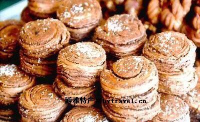 螺蛳转是北京小吃中面食中的一种,螺蛳转的变种名为“干迸儿”。旧时的大酒缸店里,喝酒的人常常是要一碗酒,到烧饼店买两个干迸儿带着,既可当酒菜又可当主食充饥,所以北京人留下一句口头语:“干迸儿就酒--嘎巴脆。” 制作方法: 1、螺蛳转以面粉、芝麻酱、油、盐、花椒及硷面为原、辅料; 2、用面粉、发面、硷一起和面后搓成长条,揪成75克左右的小剂; 3、再将面压成薄片,抹上芝麻酱,卷成筒形,按扁,从中间切开。 4、切完两块放在一起,层面向下,将背面的边捏实,用手拿起两头,一头为中心,用一只手稳住,另一只手边抻边向一个方向转,转完按扁,放入烤盘内烤熟即成。 螺蛳转的质量要求丝匀、不乱、底正、呈棕黄色。 干迸儿是将当天卖不掉的螺蛳转放入将要熄灭的炉内的马道里,经过微火余热醺烤后,水分完全散失,就成了干迸儿。干迸儿用手一压即碎,酥脆咸香,回味无穷。