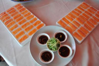 东江湖三文鱼养殖基地成立于2002年(年产500吨以上),三文鱼美食城成立于2003年,两地坐落于湖南郴州资兴美丽的东江湖畔,是一家集养殖、美食、观光旅游的好景地,东江湖的水质被评为一级水质,最难得的是:水温常年处于10度左右,夏天的西瓜不用进冰箱直接放入水中其冰镇效果比放入冰箱还好,特别是武广专线的开通后,大大缩短了游客来往于湖南湖北旅游观光并品尝美食的距离,现捕现做的游水三文鱼,未经冰冻处理,肉质和营养成分均未受到任何破坏,口感极佳,我美食城推出日本大餐最为流行的“刺身”吃法,洋为中用,溶入中国菜烹调“一鱼二吃三样式”最佳菜式。本公司全体员工诚遨世界各地游客莅临指导参观旅游以及业务洽谈(接待团游就餐)。