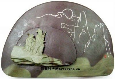 贺兰砚是宁夏五宝之一,因其砚石产自银川市区以西40公里处的贺兰山小滚钟口而得名。早在清乾隆45年编撰的《宁夏府志》地理山川部中就有记载:“笔架山,在贺兰山小滚钟口,三峰矗立,宛如笔架,下出紫石可为砚,俗呼贺兰端。”自清朝乾隆年间被发现后,一直开采至今。贺兰石是水成岩,形成于13亿年前,在古贺兰海中沉淀形成,后经造山运动而推出。其结构细密均匀,质地细腻,刚柔相济,有豆绿、深紫两色相互交错叠加,相互衬托辉映,中间还镶有石眼、玉带、朱砂带、云纹、眉子、银线、石眼、绿豆点等,自然纹理妙趣天成,形成各种象形图案。石质硬度为3度,是一种很好的砚材,用它制成的砚台,色彩对比清晰明快,古雅莹润,端庄秀丽,叩之有金玉之声,呵气可以生水,具有发墨快,墨汁细,不损笔毫等特点,历来受到文人墨客的喜爱,清末已有“一端二歙三贺兰”的说法。因石材天然两色,有别于端、歙、洮等砚,故历来制砚艺人都非常注重运用两种颜色即“俏彩”雕刻图案,自成一格。1963年,时任国家副主席的1同志视察宁夏时给贺兰砚以很高的评价:“色如端砚微深紫,纹似金星细如肌,配在文房成四宝,磨而不嶙性相宜。”上百年来,凡到过宁夏的人士莫不以能得到一方贺兰砚或贺兰石雕艺术品为乐事。